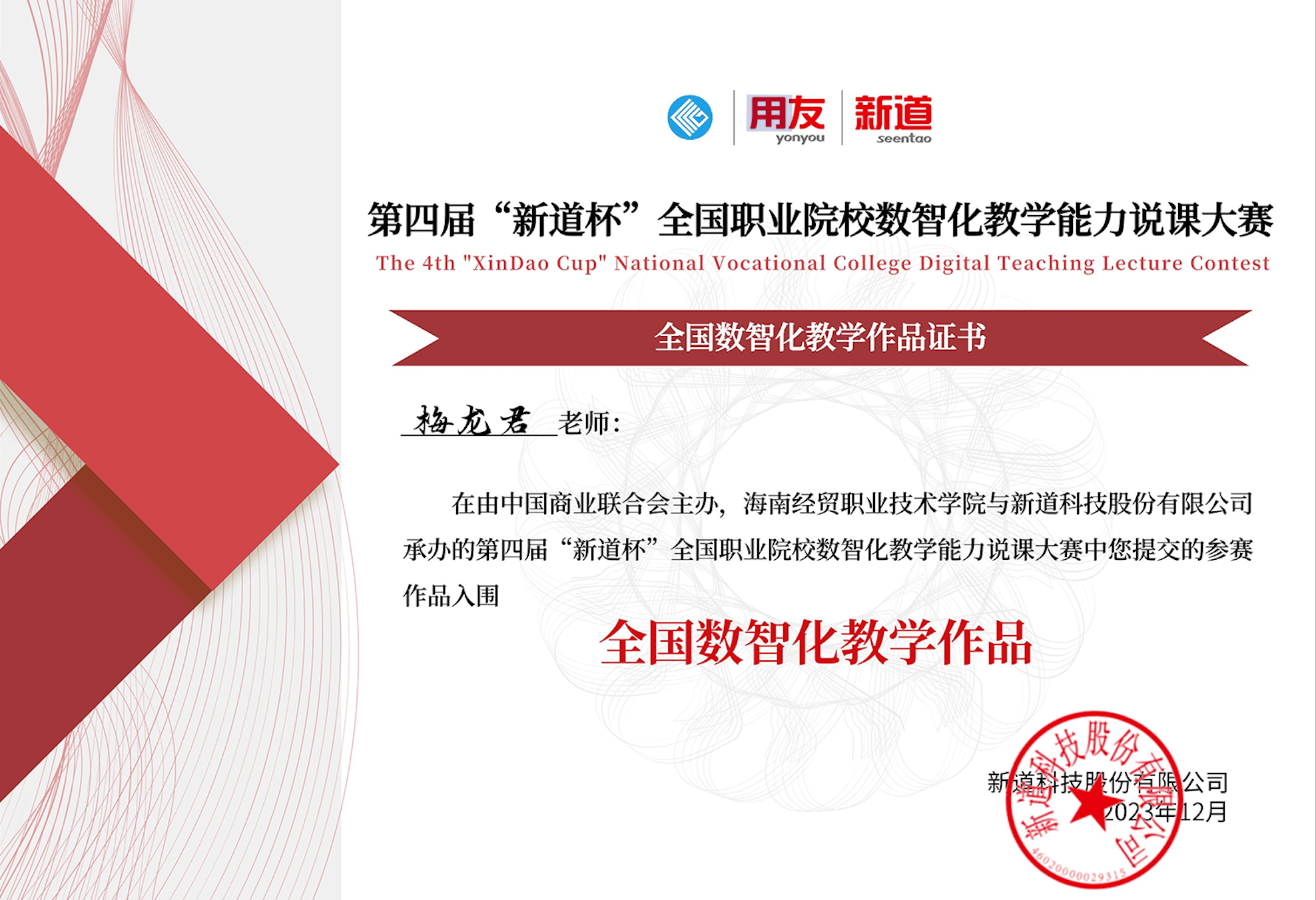 由中国商业联合会主办,用友新道科技股份有限公司和海南经贸职业技术学院承办的第四届“新道杯”全国职业院校数智化教学能力说课大赛经过紧张的评审,最终确定了20名全国优秀的参赛教师晋级本届大赛的线下全国总决赛。PP电子游戏官网教师梅龙君位列其中!