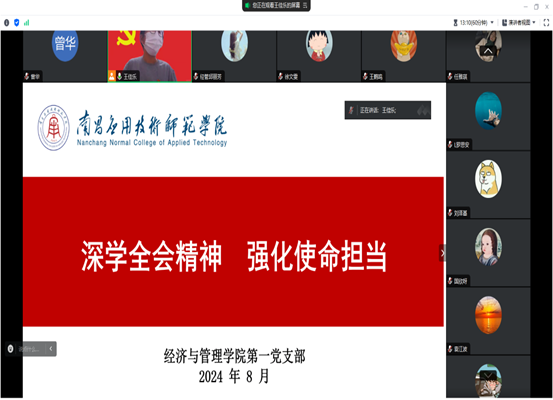 为深入学习宣传贯彻党的二十届三中全会精神,迅速掀起学习宣传贯彻热潮,PP电子游戏官网第一党支部于2024年8月25日开展“深学全会精神,强化使命担当”八月主题党日活动,活动由第一党支部书记王佳乐主持,全体党员参加。