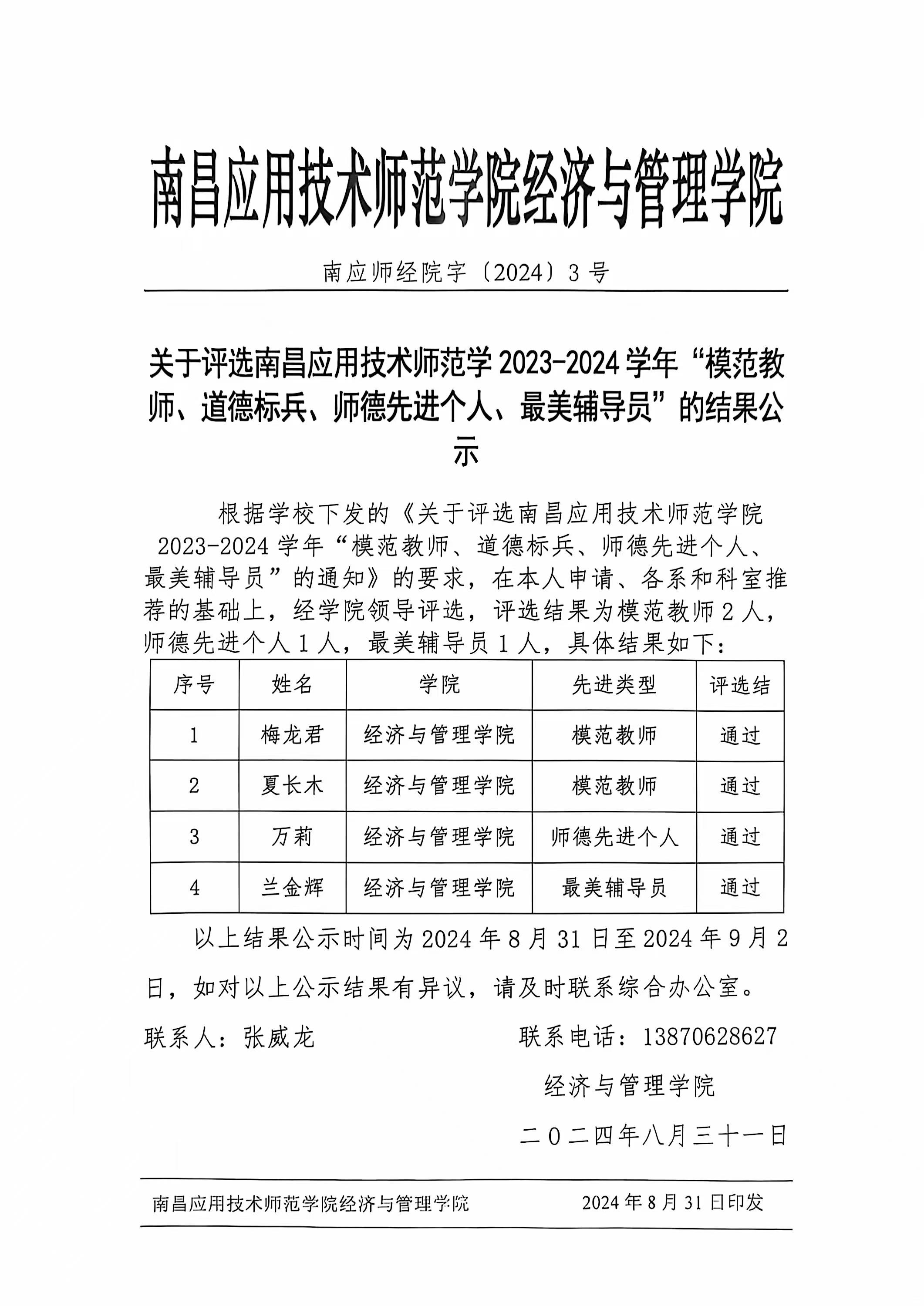 教学管理 学院新闻 学院公告 学科竞赛 您现在的位置是:首页 > 教学管理 > 学院公告 关于评选南昌应用技术师范学2023-2024学年“模范教师、道德标兵、师德先进个人、最美辅导员”的结果公示 管理员2024-08-313926 上一篇 PP电子游戏网站召开新任干部任职宣布会