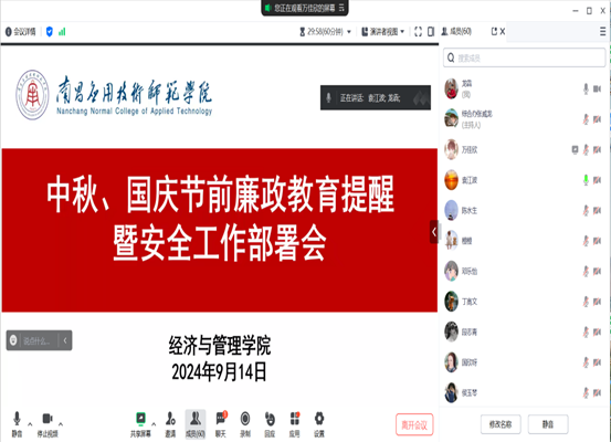 为进一步巩固党纪学习教育成果,深入贯彻落实中央八项规定精神,时刻筑牢作风建设防线,严防不正之风滋生蔓延,使遵规守纪意识入脑入心,2024年9月14日,PP电子游戏网站通过线上腾讯会议组织召开中秋、国庆节前廉政教育提醒暨安全工作部署会,会议由党总支书记龙犇主持,学院全体教职工参会。