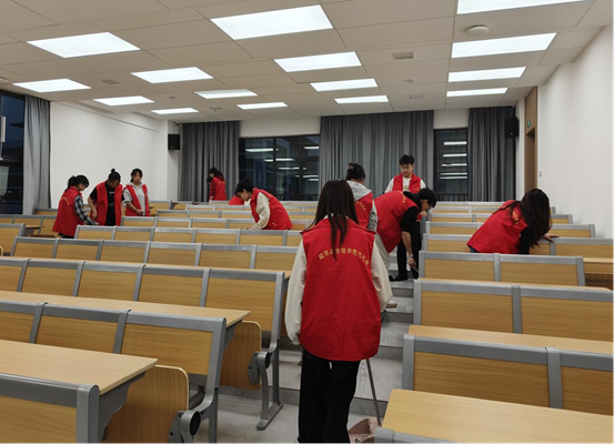 活动期间,党员教师充分发挥党员的带头示范引领作用,带领学生入党积极分子共同手持扫把、垃圾桶等劳动工具,不畏脏、不怕累,分工明晰且相互协作,干劲满满,细致清理卫生死角与盲区。在大家的齐心协力下,二教B座2至3楼的环境焕然一新,干净的地面、整洁的讲台桌、清洁的抽屉以及明亮的走廊,无一不展现着他们的辛勤劳作。红马甲在教室与楼道间忙碌穿梭,构成一道亮丽的风景线。