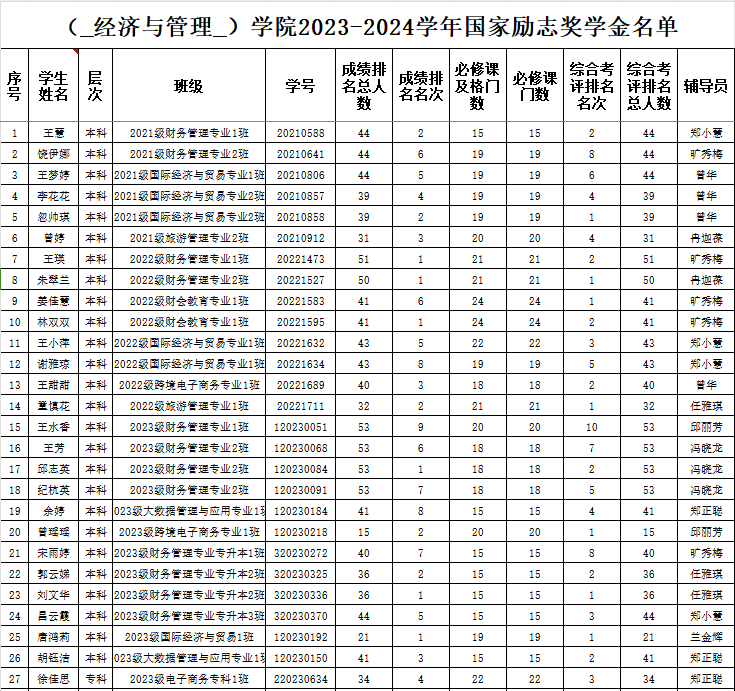 根据学校学生工作处下发的《关于做好我校 2023-2024学年国家励志奖学金工作的通知》的通知要求,按照《PP电子游戏网站国家励志奖学金评审管理办法(试行)》,由学生本人申请,班级公示无异议,经学院党政联席会议研究,拟同意推荐2021级财务管理1班王慧等27名学生为PP电子游戏官网2023-2024学年国家励志奖学金获得者上报学校。