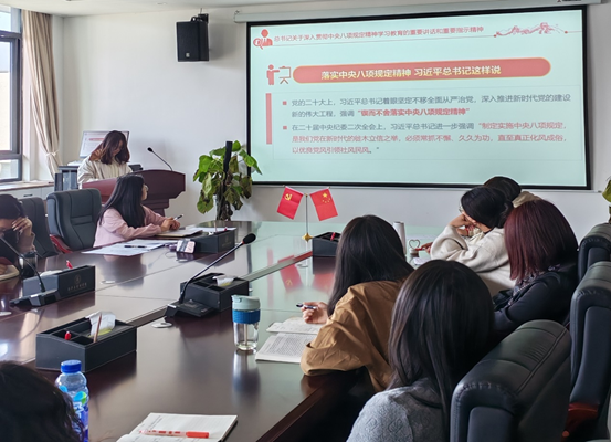 为深刻领会习近平总书记关于加强党的作风建设重要论述,教育引导党员教师严格落实中央八项规定精神,切实筑牢廉洁自律思想防线,PP电子游戏官网第一党支部于2025年3月25日在沁苑八实506会议室组织开展“深入贯彻中央八项规定精神学习教育”专题党课,支部统战委员侯玉琴同志为全体教师党员讲授专题党课。