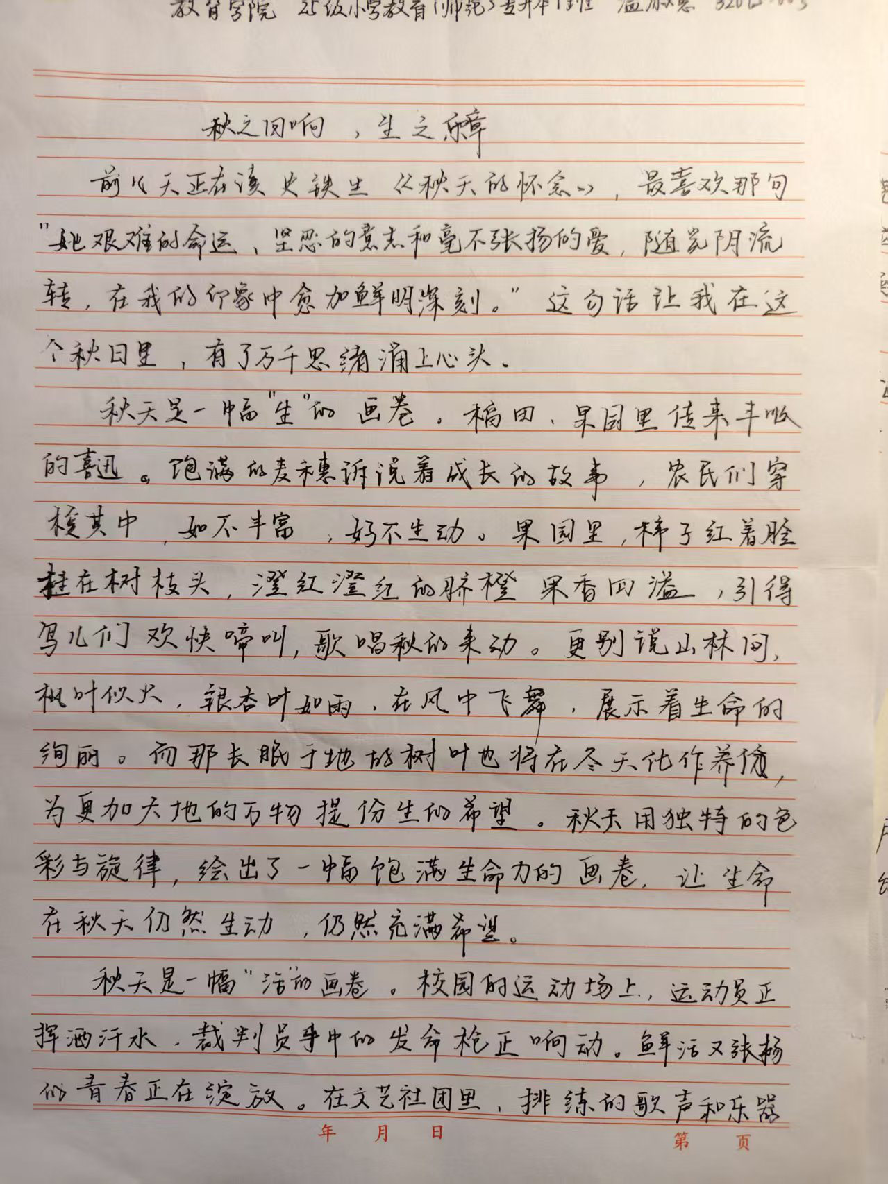 “本次“一叶知秋,落笔成诗”主题征文,以写作为核心抓手,着力推动学生将“爱读书、读好书”的阅读积累,转化为“善表达、勤动笔”的写作实践——既实现从知识输入到思想输出的关键跃升,也完成读写能力的闭环训练。活动围绕“秋”这一内涵丰富的主题,引导学子在文字中挖掘秋的文化意蕴、品味秋的生活质感,进而增强文化自信与自我认同感,实现思想淬炼与写作技能的双重突破。