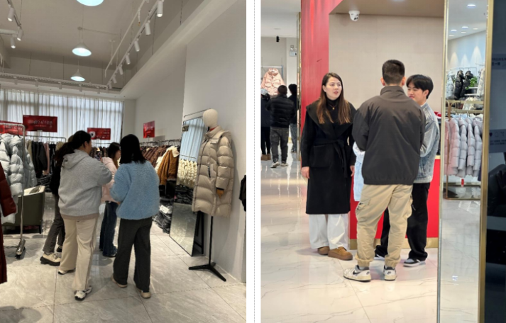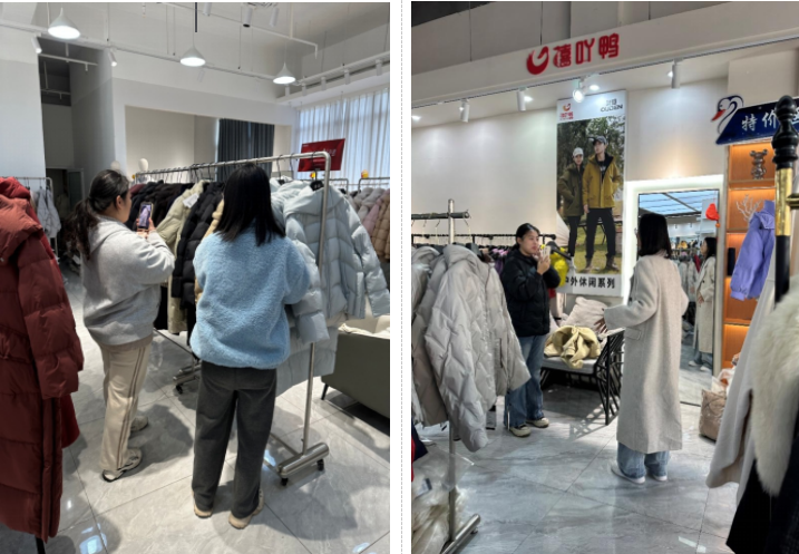 实践核心环节,同学们分组对接共青城市服装小镇内多家羽绒服装门店,例如:鸭鸭、嘻吖鸭等知名品牌,化身“直播助销员”。从提前熟悉产品卖点、撰写直播脚本,到调试设备、与观众互动讲解,大家全程参与直播流程:不仅向网友介绍羽绒服装的保暖性能、设计理念,还结合专业知识科普跨境购买的关税政策与物流时效,助力门店扩大线上影响力。下面是学生直播过程中记录的照片。