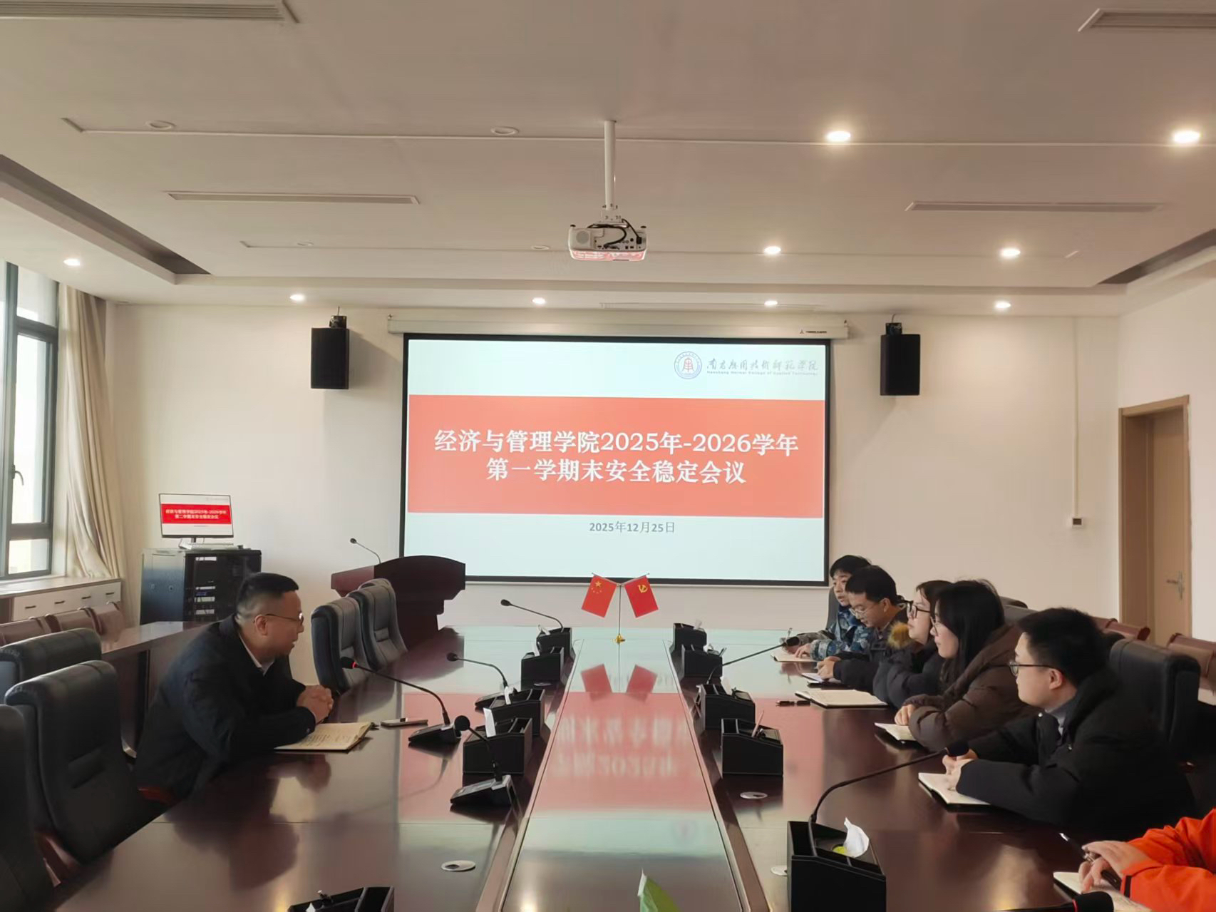 会上龙犇分别传达了全省安全稳定工作视频会议、学校安全稳定会议精神,通报了近期校园安全工作开展情况,梳理了消防安全、交通安全、心理健康、校园周边治理等方面存在的隐患与问题。针对期末安全稳定工作重点,龙犇作出具体部署:一是强化意识形态阵地管理,严防不良思潮渗透,筑牢校园思想防线;二是狠抓消防安全,规范消防设施使用与维护,开展消防隐患排查整治,提升师生应急处置能力;三是加强交通安全管理,引导师生树立交通安全意识;四是关注学生心理健康,聚焦重点人群开展心理疏导与关怀,及时化解心理危机;五是严格校园管理与校外培训监管,规范实习实训安排,严防各类安全事故;六是做好寒假前学生离校管理工作,确保假期校园安全。