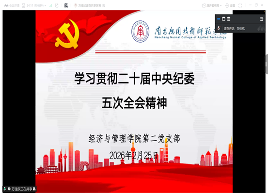 会上支部书记万佳欣组织全体党员深入学习贯彻二十届中央纪委五次全会精神,专题学习《中共中央关于制定国民经济和社会发展第十五个五年规划的建议》及中国共产党第二十届中央纪律检查委员会第五次全体会议公报。学习过程中,万佳欣结合支部实际工作,对全会精神和规划建议的核心要义进行了细致解读,引导支部党员深刻认识全面从严治党的重要性。