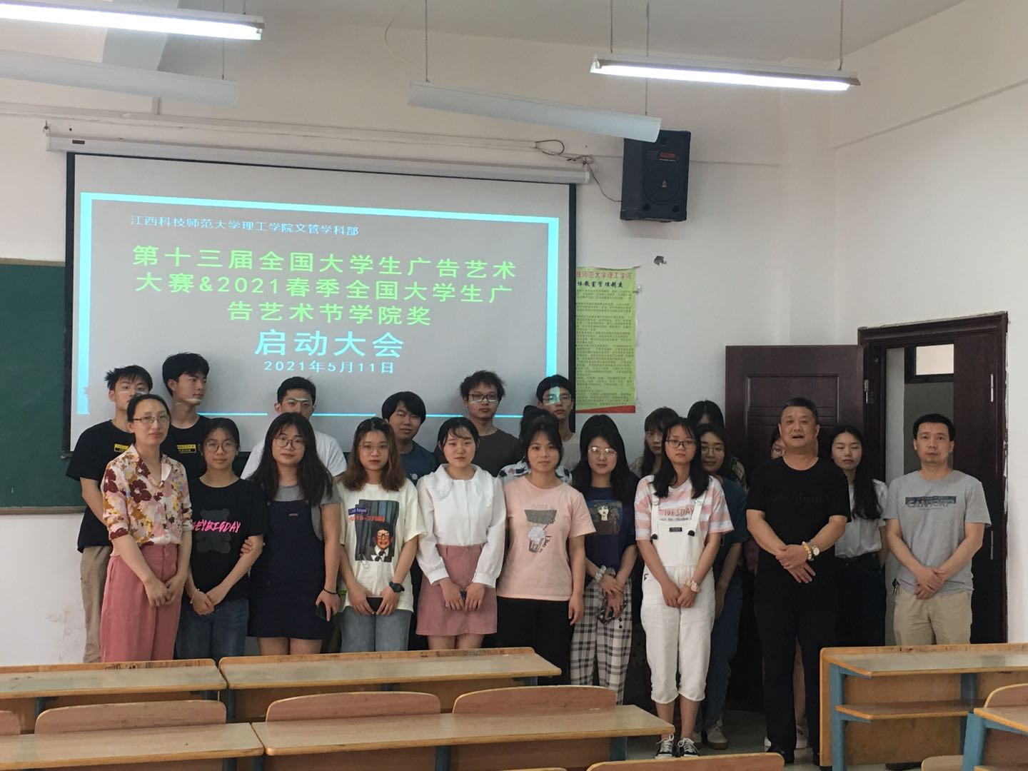 文管学科部就第十三届全国大学生广告艺术大赛(简称大广赛)和2021春季中国大学生广告艺术节学院奖启动大会于2021年5月11日上午10点50分在教学楼2206教室顺利召开。副主任王一飞、专任教师黄伟、唐芬及部分参赛学生参加了启动大会。