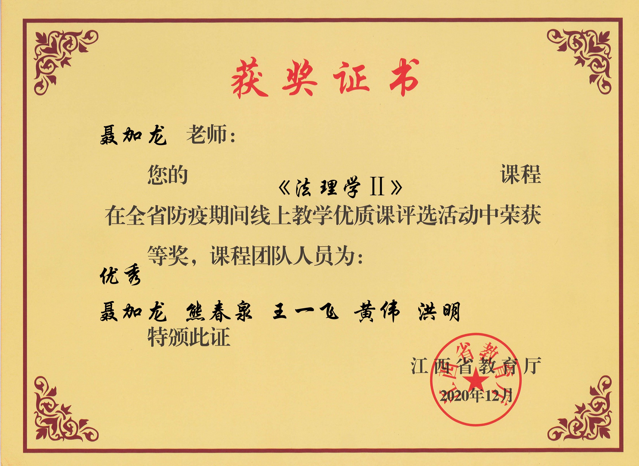 聂加龙老师是经济管理学院法学专任老师,教学效果优秀,深受学生爱戴。他教授的《法理学》是一门抽象难懂的课程,为了使学生学好这门课,他尝试多种教学方法。特别是在全民战“疫”的特殊时期,聂加龙老师以参与的省教改课题“《法理学》研究性教学探索与实践”总结出的“小组‘法律观察报告’”、“问题单”、“课堂主题性讨论”与“模拟法律职业宣示”等教学方法开展《法理学Ⅱ》线上教学,取得了特别好的教学效果,不仅获得了学生的好评,还荣获2020年江西省防疫期间线上教学优质课程优秀奖。