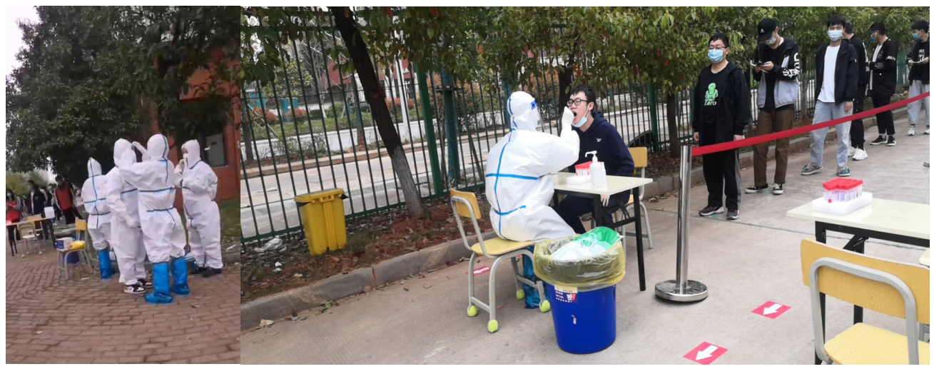 在核酸检测现场,学院领导指挥得力,各小组分工明确,学生会干部和党员、预备党员组成多支志愿者队伍,协助检测人员,加强采样现场的组织引导,避免人群聚集,严格落实采样点交叉感染,执行各项防控要求,确保全员核酸检测时没有漏采人员,没有因现场人群聚集造成疫情传播。