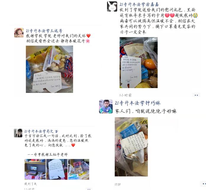 隔离学子收到学院辅导员送来的爱心水果物品和辅导员亲笔爱心贺卡,同学们内心深处感动无比,感谢学院的关爱之情。我们共同期待疫情早日结束。